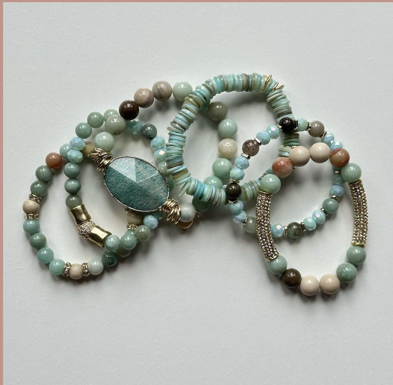If elegance had a signature stack, Etherea would be it. This dreamy six-piece bracelet set blends the serene beauty of Amazonite stones with glistening crystal beads, all kissed with touches of gold and pavé crystal for a look that’s effortlessly luxe. Soft, ethereal hues meet just the right amount of sparkle, making this stack a go-to for everything from casual coffee dates to nights that call for a little extra magic.