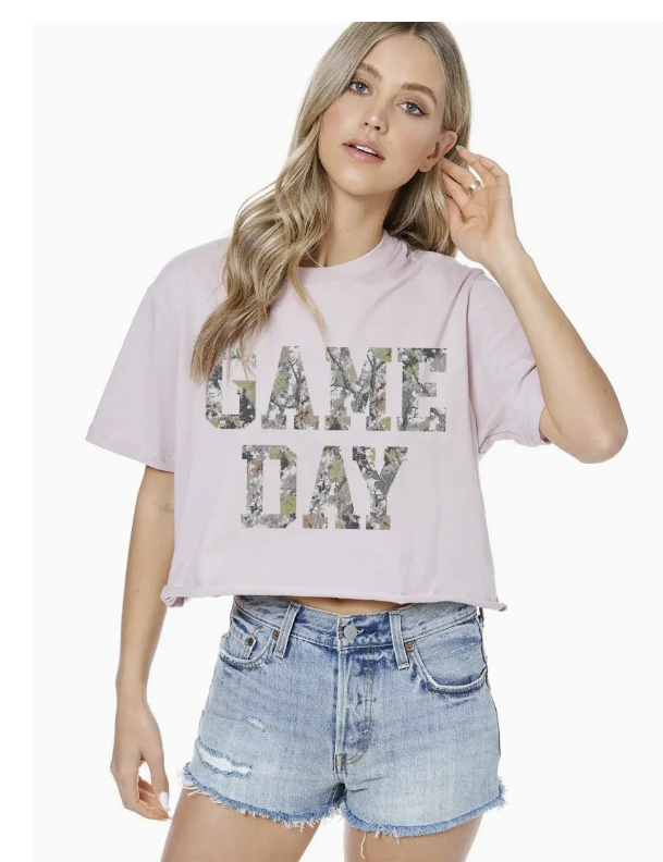 Game day leaf camo graphic, premium cotton, relaxed fit, cotton cropped top with raw hem edge detail