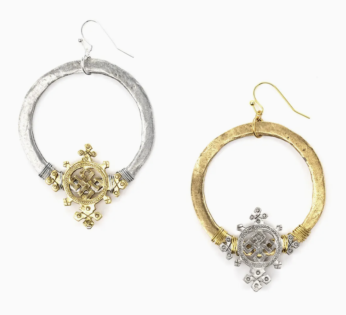 This large hammered hoop is wire wrapped with our classic Coptic cross. 2.75" overall length. 2-Tone is gold cross on silver hoop.