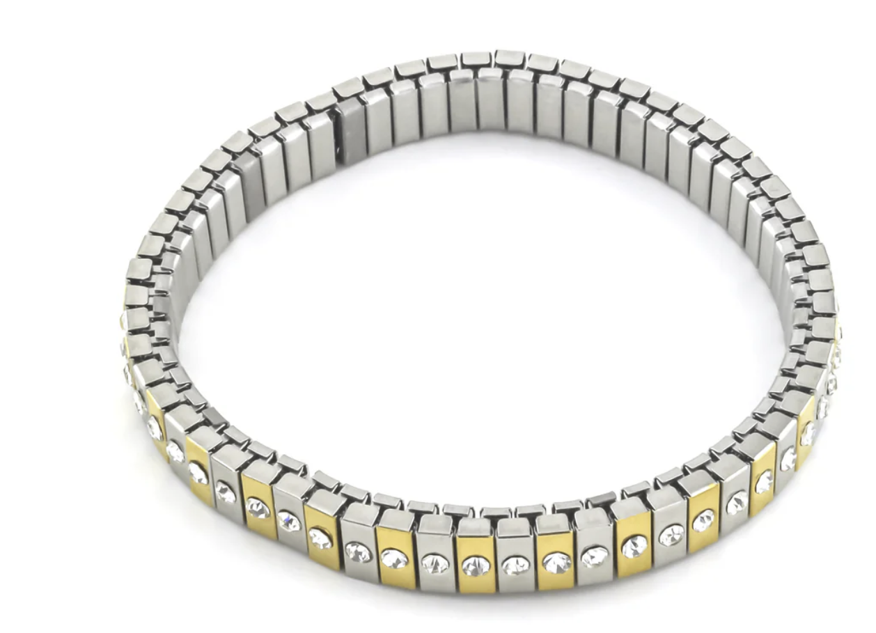 - Indulge in luxury with our Jasper Bracelet. This stunning mix of gold and silver, dotted with crystals, adds a touch of sparkle and elegance to any outfit. Perfect for everyday wear, either on its own or layered with other pieces for a sophisticated stack. Elevate your style and stand out from the crowd with this exclusive bracelet.
