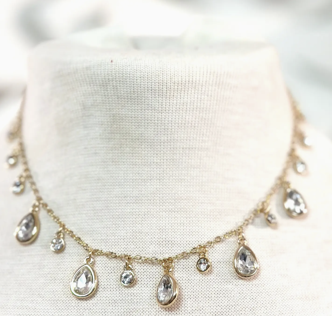 Gold chain with silver and smoke color gems.