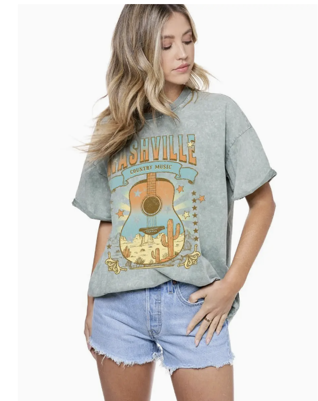 Nashville country music vintage graphic, premium cotton, boyfriend fit, rolled cuff, snow-dyed tee