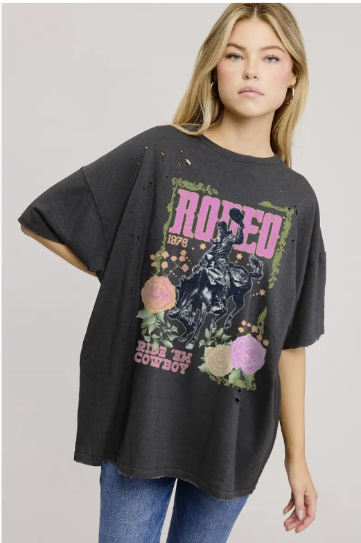 Rodeo 1976 ride 'em cowboy graphic, distressed oversized seamless washed tee